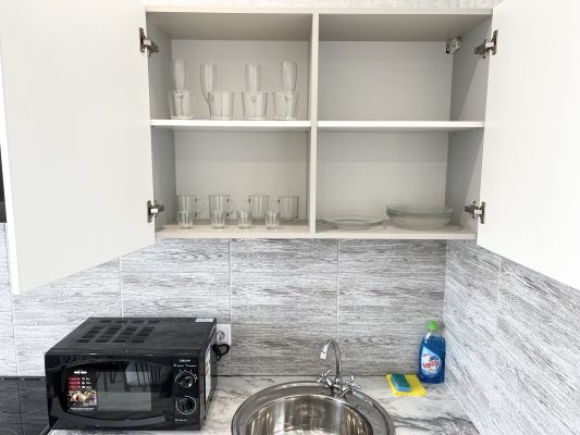 Кухня оснащена всеми необходимыми бытовыми приборами (холодильник, микроволновка, электрический чайник, духовка) и столовыми принадлежностями (кастрюли, сковорода, кружки, тарелки, столовые приборы).