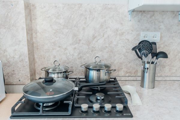 Кухня полностью укомплектована техникой, посудой и столовыми приборами.