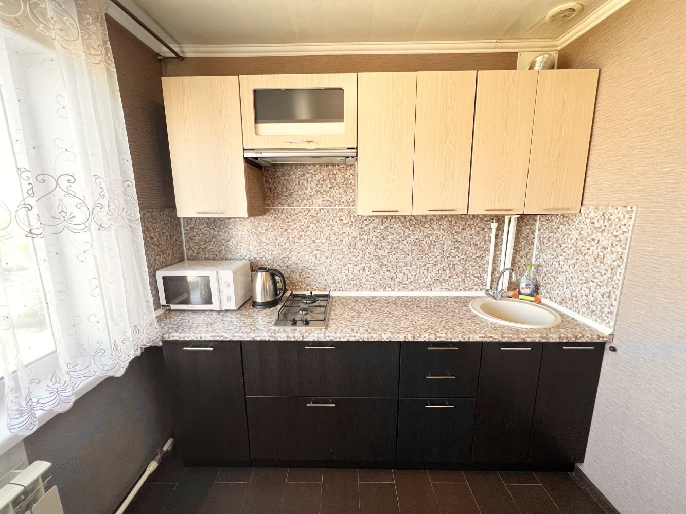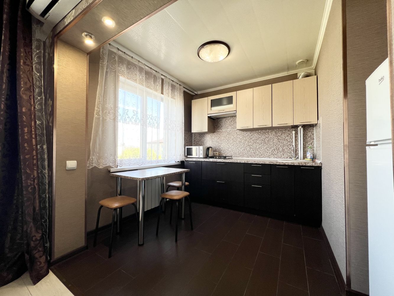 Кухня оснащена всеми необходимыми бытовыми приборами (холодильник, микроволновка, электрический чайник) и столовыми принадлежностями (кастрюли, сковорода, кружки, тарелки, столовые приборы).