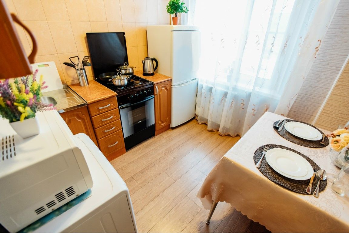Кухня оснащена всеми необходимыми бытовыми приборами (холодильник, микроволновка, электрический чайник) и столовыми принадлежностями (кастрюли, сковорода, кружки, тарелки, столовые приборы).