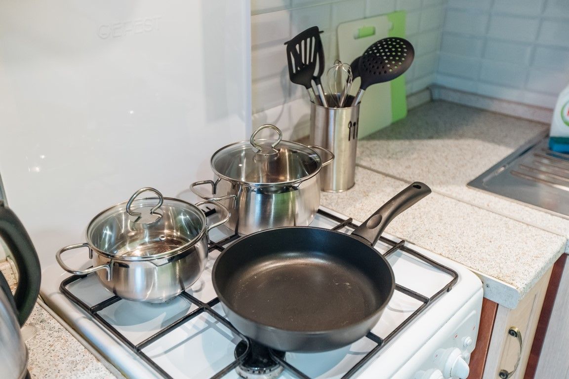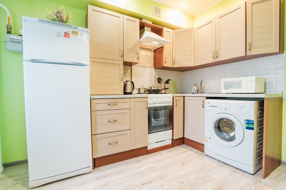 Кухня оснащена всеми необходимыми бытовыми приборами (холодильник, микроволновка, электрический чайник) и столовыми принадлежностями (кастрюли, сковорода, кружки, тарелки, столовые приборы).